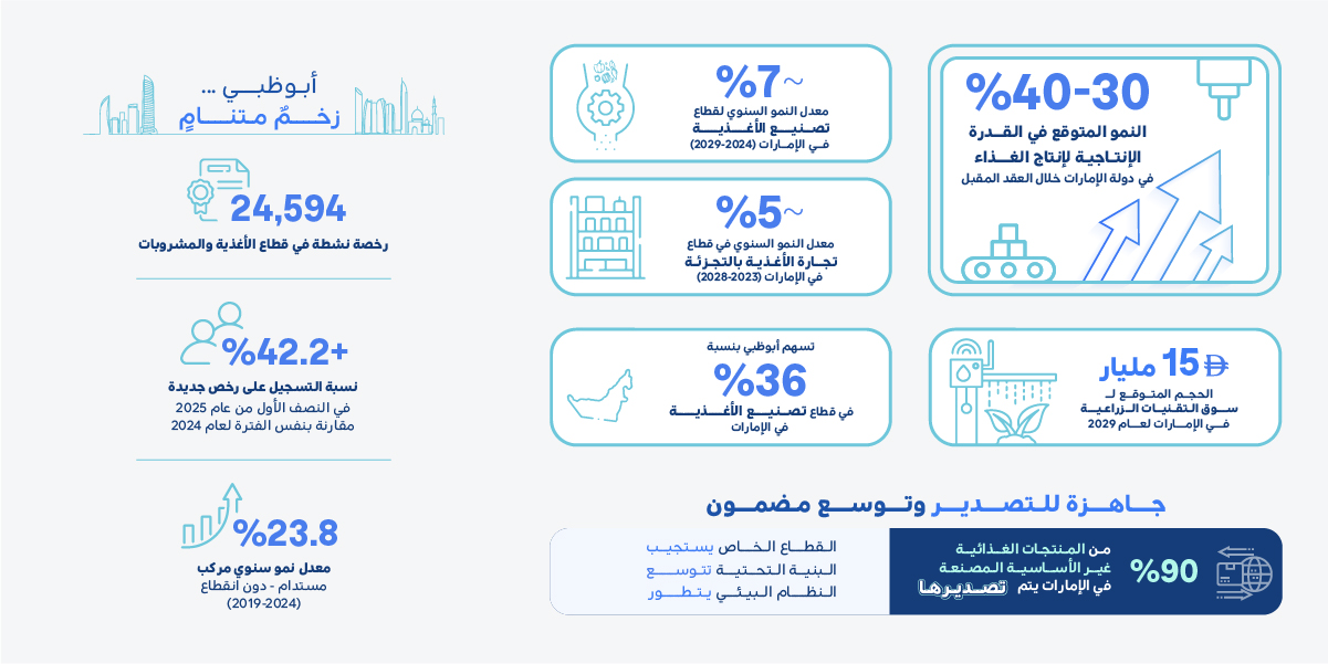 وفي إطار التوافق مع استراتيجية أبوظبي الصناعية ومبادرة "اصنع في الإمارات"، تواصل دولة الإمارات توسيع إنتاجها الغذائي المحلي وتعزيز قدراتها التصديرية للمنتجات عالية الجودة مع توقعات بارتفاع الطاقة الإنتاجية الوطنية للمنتجات الغذائية بنحو 30% إلى 40% خلال العقد المقبل، مدفوعة بنمو التقنيات الزراعية، وتوسع التصنيع، واستمرار تطوير أسواق التجزئة والاستهلاك.